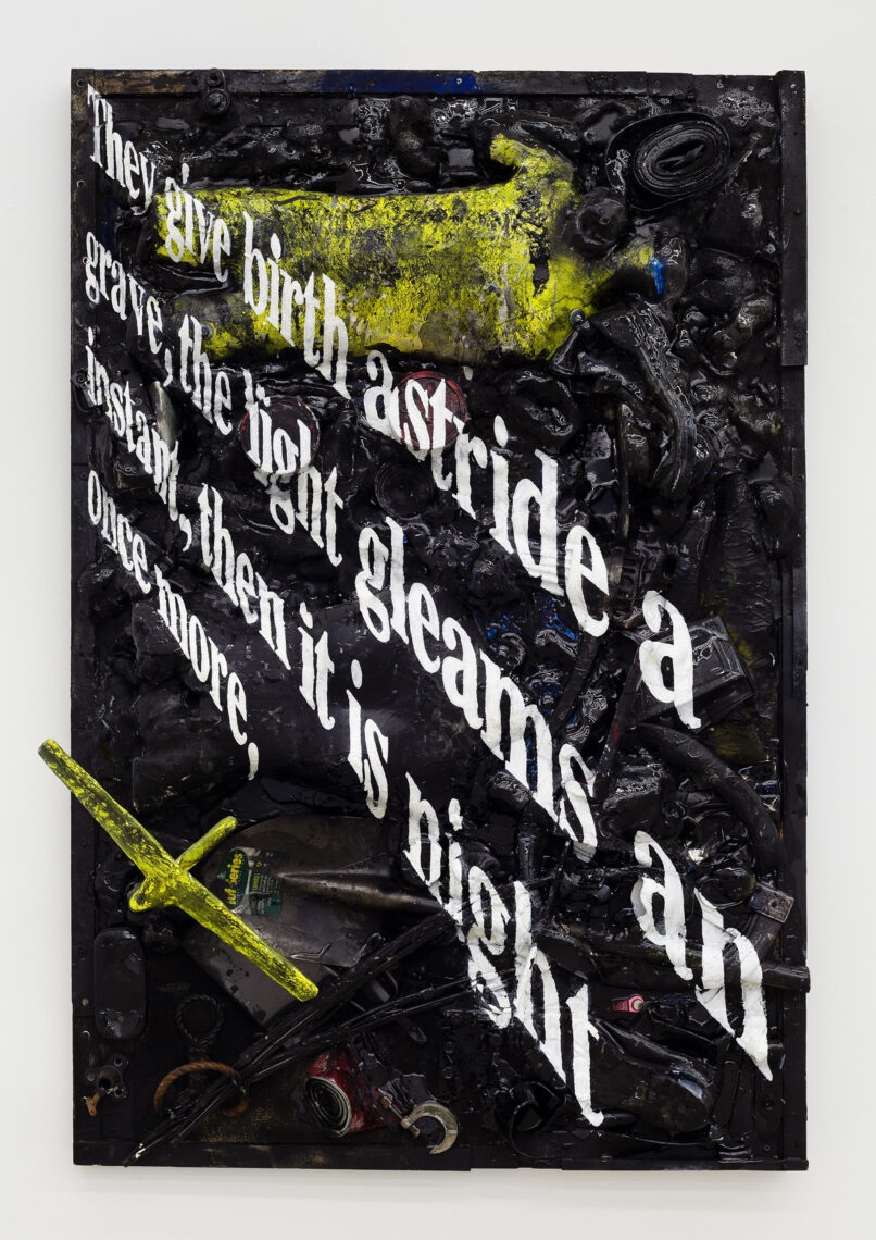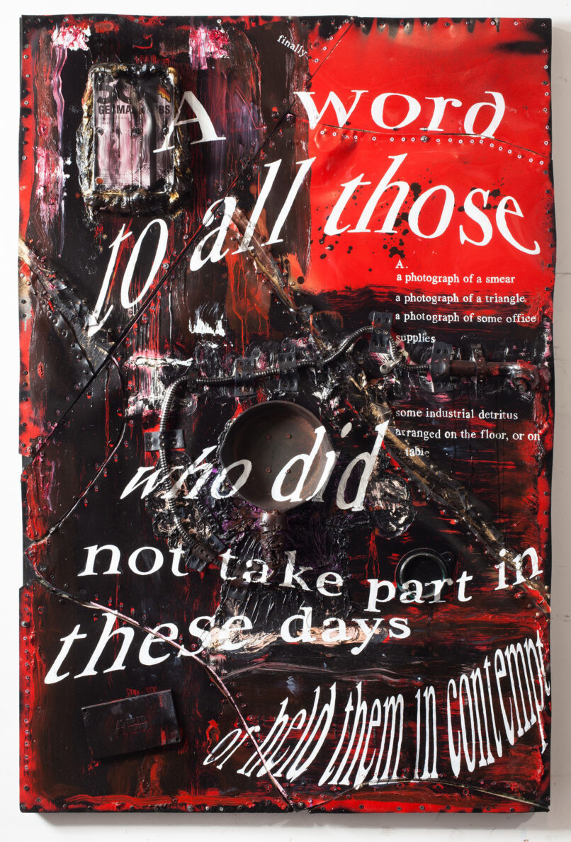 acting as a kind of human trash compactor. The title “Squeezed Reliefs” was a literal translation of Donatello’s “rilievo schiacciato”, a form which was the height of perspectival illusionism in the 15th century. My use referred to a literal compression of material, as well as the colloquial f inancial “squeeze”. On the lumpy, irregular surfaces of the reliefs, I projected and painted two types of poetry: copies of the bills, demands, and threats I had collected from various creditors and scam artists, and lines from poetry and literature which I felt expressed my subjective position in relation to them.