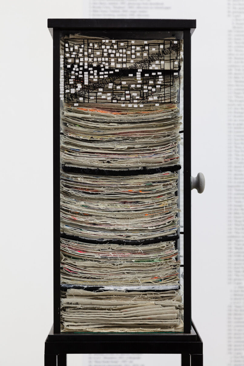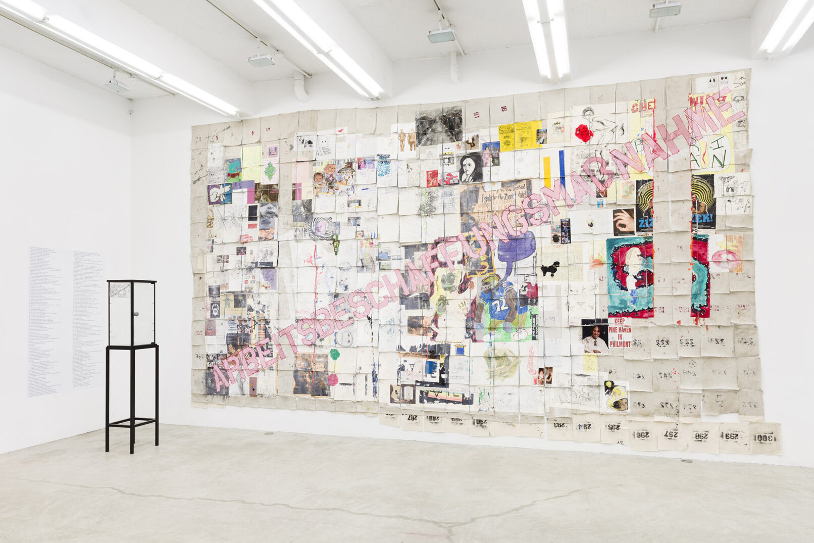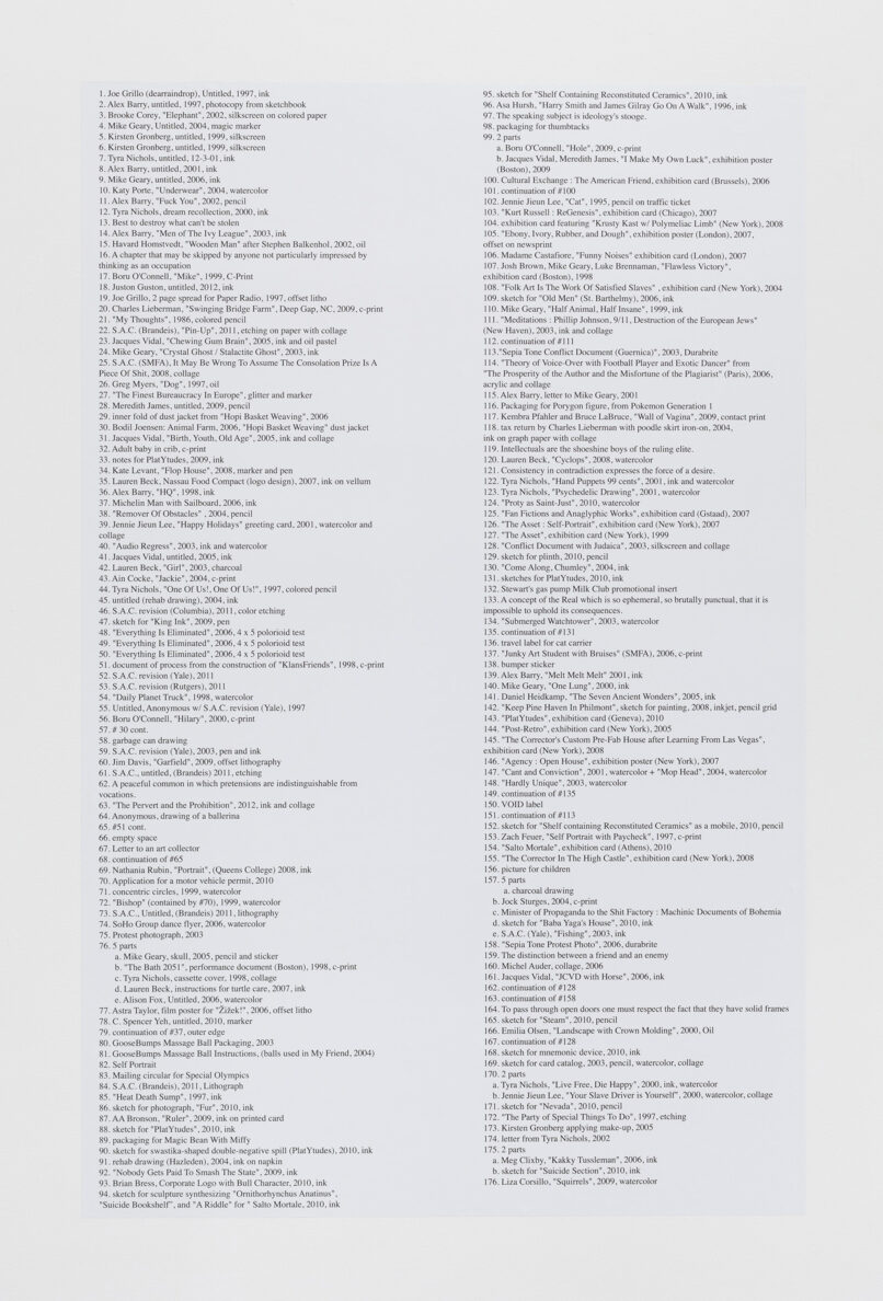 The sculpture in the show was a variation on Marcel Broodthaers famous “Pense Bete”, made from copies of one of my own catalogues. The contents of the large collage, entitled “Arbeitsbeschaffungsmaßnahme”, are diagrammed on the side of the glass case in which it is sometimes displayed and an accompanying wall label.